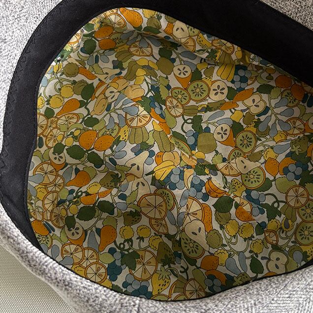 裏地は薄手のコットン。イエロー系でフルーツ柄が描かれています。
