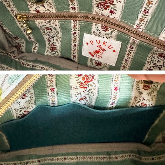 裏地にはグリーンのストライプにアンティークな花柄がプリントされたコットンツイルを使用しました。