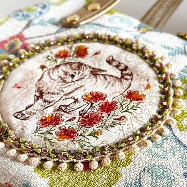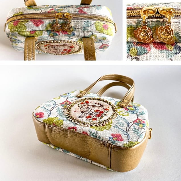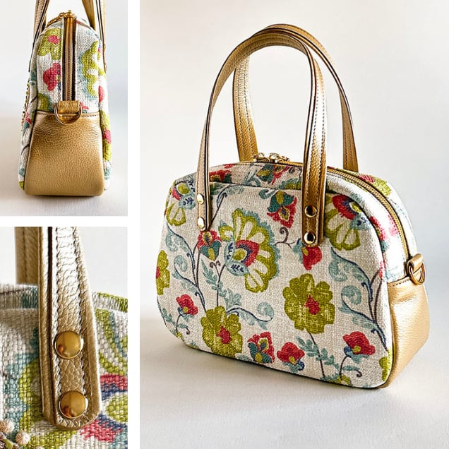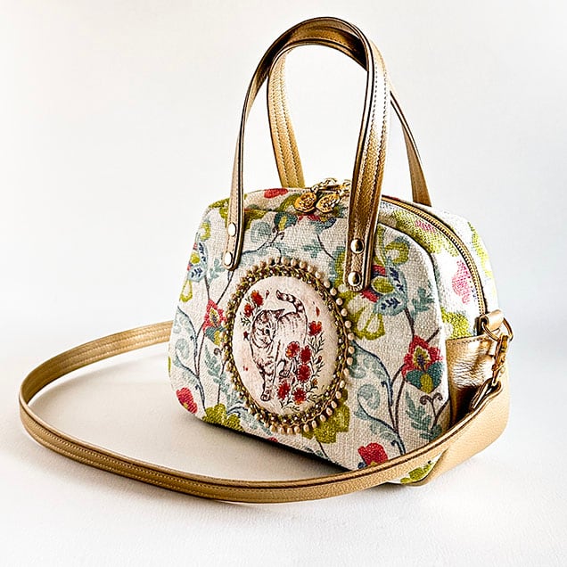 このバッグに使用されている生地は、スペインのファブリックメーカー「コマーソン(Comersan)」社の製品で、ウィリアム・モリスの図柄。蔦のような曲線的な植物模様が美しく配置され、優雅でクラシカルな雰囲気があります。イエローグリーンやブルー、朱色などの花柄が全体に配されており、落ち着いた色合いながらも華やかさがあります。