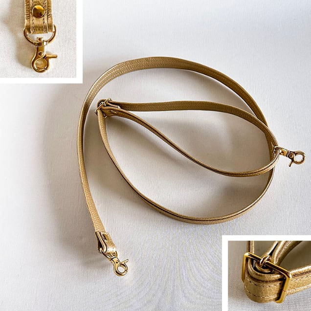 底・ハンドルなどにはゴールドの牛革を使いました。手触りがよく柔らかで程よくハリもある高品質な牛革です。