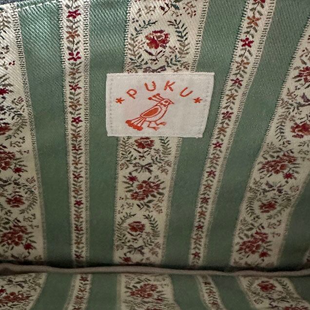裏地はグリーンのストライプに花の紋様が描かれたコットンツイルです。厚手で丈夫な生地です。