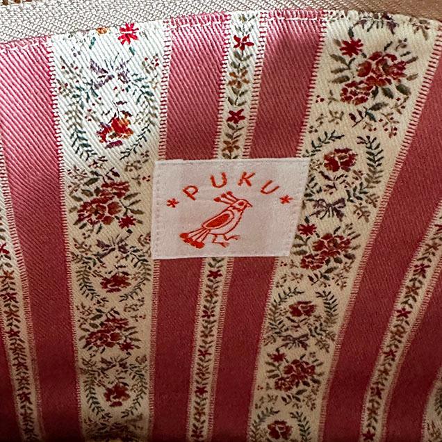 裏地は赤のストライプに花の紋様が描かれたコットンツイルです。厚手で丈夫な生地です。