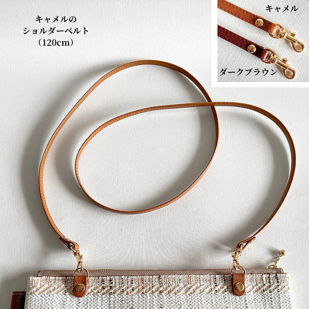 8mm幅・120cmの牛革ショルダーベルトも付属し、取り外しや長さ変更も可能です。