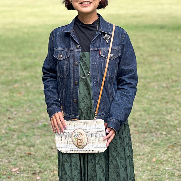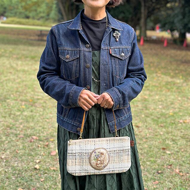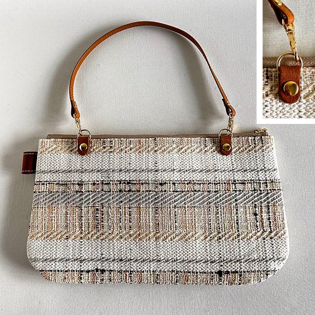 背面には牛革パーツと丸カンを組み合わせた持ち手(キャメル色・40cm)付き。
