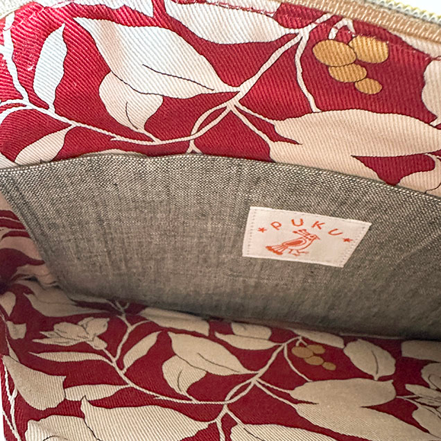 裏地は赤をベースに白い葉っぱの柄が描かれたコットンツイルです。