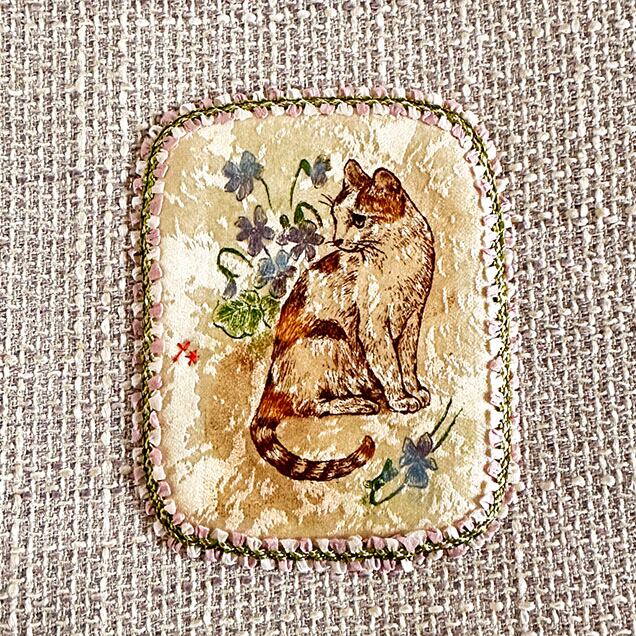 中央の銅版画は、スミレの花に囲まれた三毛猫を描いたもの。柔らかな毛並みや遠くを見つめるような表情が印象的で、どこかアンティークカードのような詩的な雰囲気です。銅版画のまわりには木馬のリボンレースを丁寧に縫い付けました。