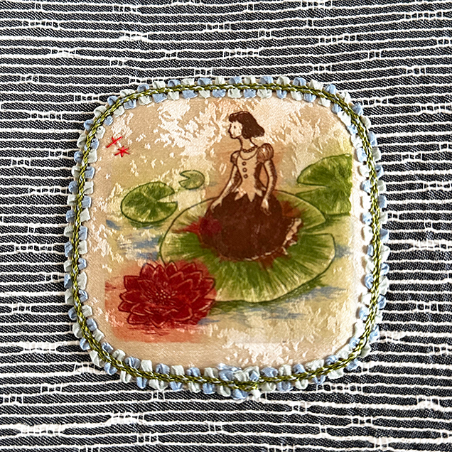 銅版画は、アンデルセン童話『親指姫』のワンシーン。睡蓮の葉の上に座る可憐な親指姫と赤い花を描き、静かな水辺の美しさを表現しました。柔らかな色合いがアンティーク絵本のような雰囲気を漂わせます。銅版画のまわりには木馬のリボンレースを丁寧に縫い付けました。