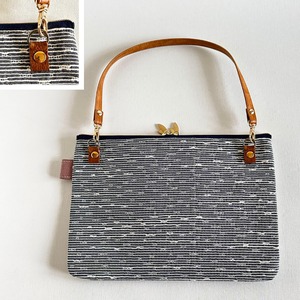 背面には牛革と丸カンを組み合わせたパーツを付け、取り外せる持ち手(キャメル色・40cm)を付けました。