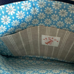 裏地は水色に白い花柄のコットンで、18×11cmの内ポケットが1口あります。