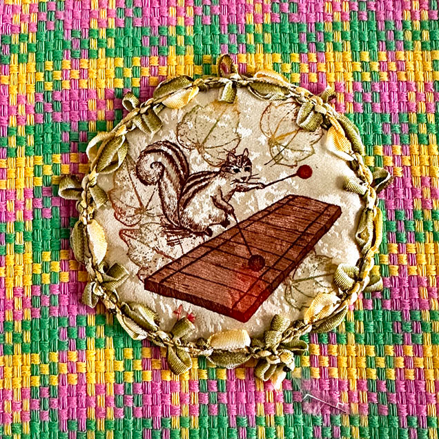 銅版画には、木琴を演奏するシマリスを描きました。小さなバチを握って一生懸命に奏でる姿が愛らしく、まるで森の音楽会が始まるよう。背景の葉が優しく音色を包み込み、見ているだけで心が温まります。銅版画のまわりには木馬のリボンレースを丁寧に縫い付けました。