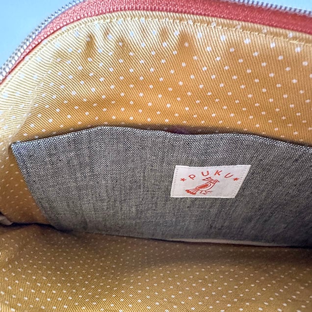 裏地は山吹色に白いドット柄のコットンで、18×11cmの内ポケットが1口あります。