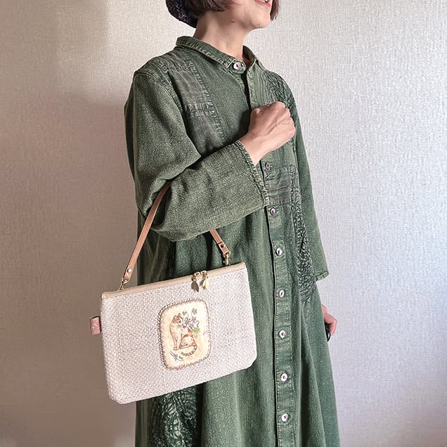 背面には牛革と丸カンを組み合わせたパーツを付け、取り外せる持ち手(ダークブラウン・40cm)を付けました。