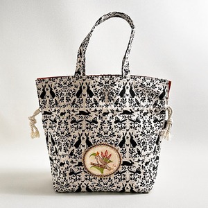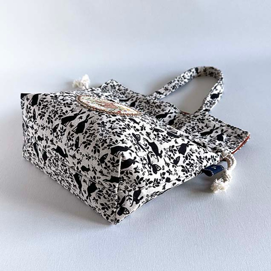 ナチュラルな麻色にブラックでうさぎや蝶々のシルエットが描かれたコットンリネンを使用し、洋装にも和装にも合わせやすいデザインです。