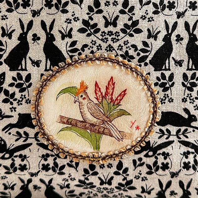 手染めしたシルクの生地に刷った銅版画は、カラフルな毛色のオカメインコです。