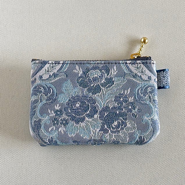 このコインパースに使用した生地はイタリア製の水色のジャガード織。ダマスク柄で花が描かれています。光沢のある美しい生地です。