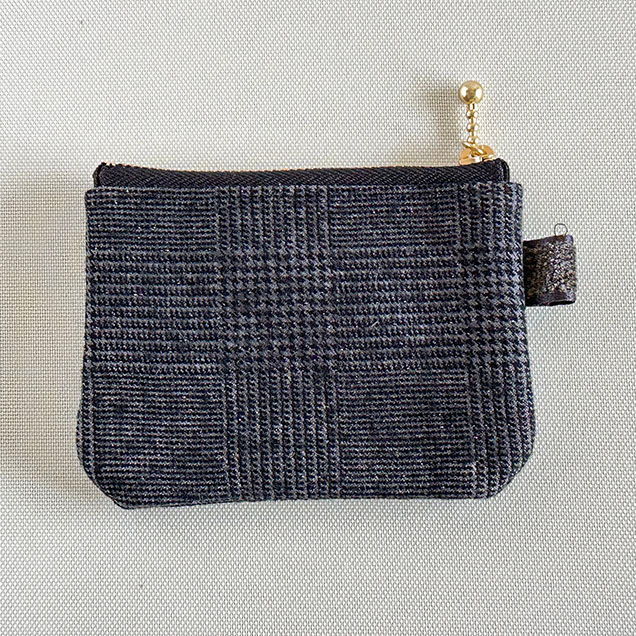 このコインパースに使用した生地は欧米の高級ブランドのウール生地を使いました。ブラックとグレーのグレンチェックでさりげなくキラキラしたラメ糸も織られているので地味にならずに華やかです。