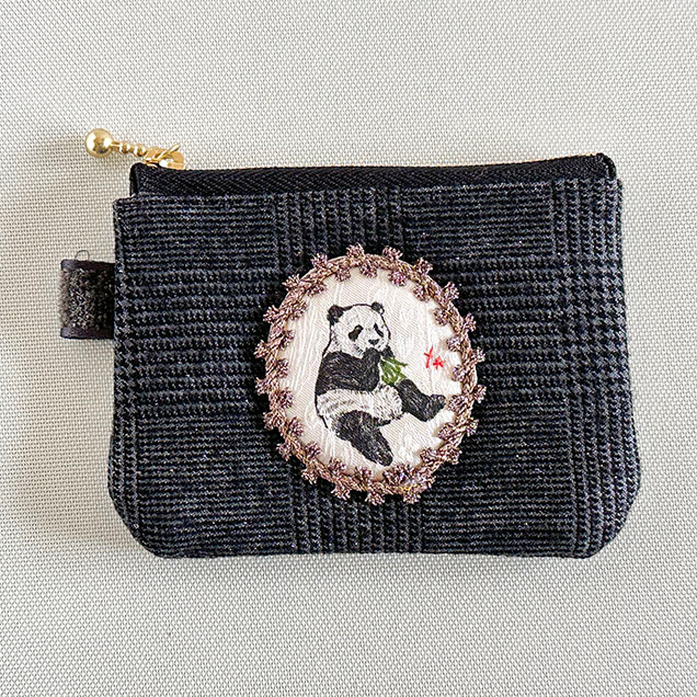 紅茶染めしたシルクサテンに刷った銅版画は、笹を頬張る『食べるパンダ』。MOKUBAのブレードを縁取りにあしらい、柔らかなアクセントを添えました。
