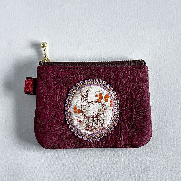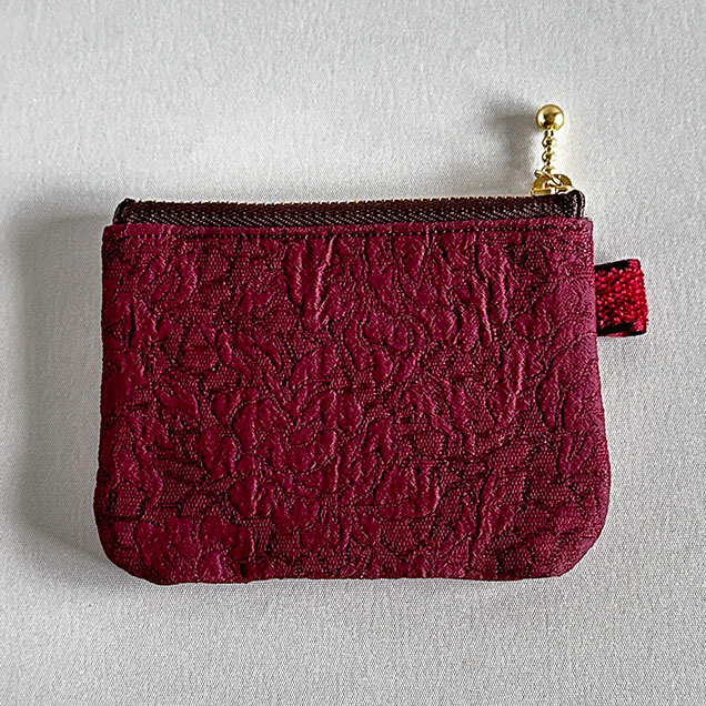 このコインパースにはワインレッドに薔薇柄が織られたジャガード織の生地を使用しました。さりげなくきらりと輝く糸も織られた日本製の生地です。