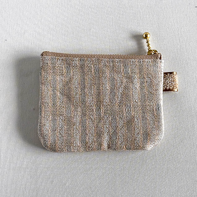 このコインパースにはイタリア製の麻(リネン)を使用しました。淡いグレー、オレンジ色の糸を使い柄が織られた高級感ある生地です。