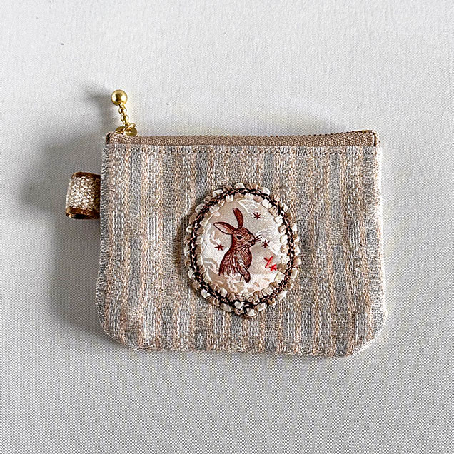 紅茶染めしたシルクサテンに刷った銅版画は、小さなうさぎを描いた『星うさぎ』。木馬のレースを縁取りにあしらい、柔らかく仕上げました。