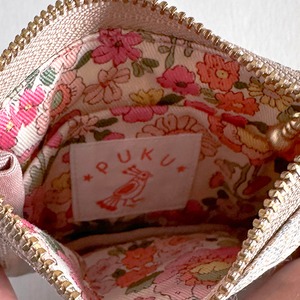 裏地はアイボリーにピンクの花柄がプリントされたコットンツイルです。仕切りになるポケットが一口あります。