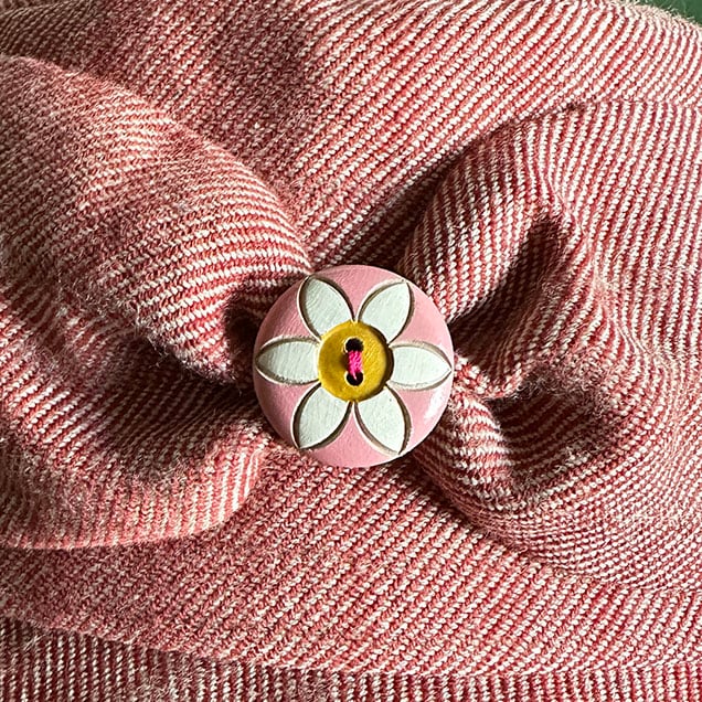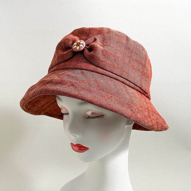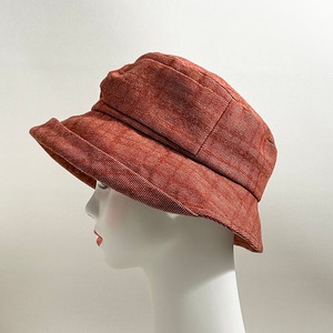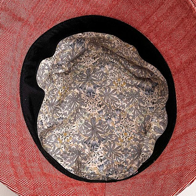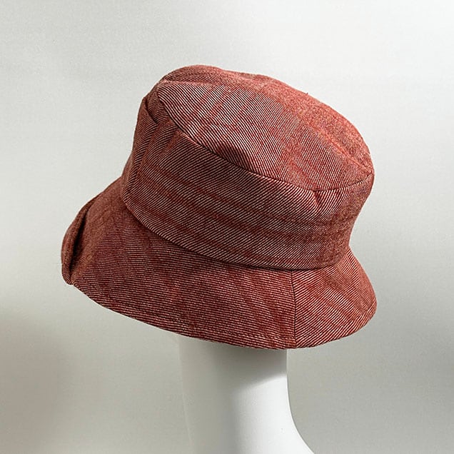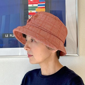 こちらのバケットハットにはちょっとくすんだレッドのウールを使いました。チェック柄はほんのり淡いのでお洋服に合わせやすいです。