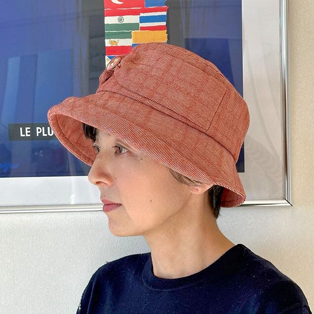 私は帽子は大好きなのですが。丸顔のせいなのかハットが全然似合わなくて。そんな苦手意識のある丸顔さんにも抵抗なく被れるバケットハットをデザインしました。