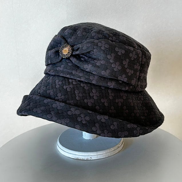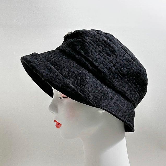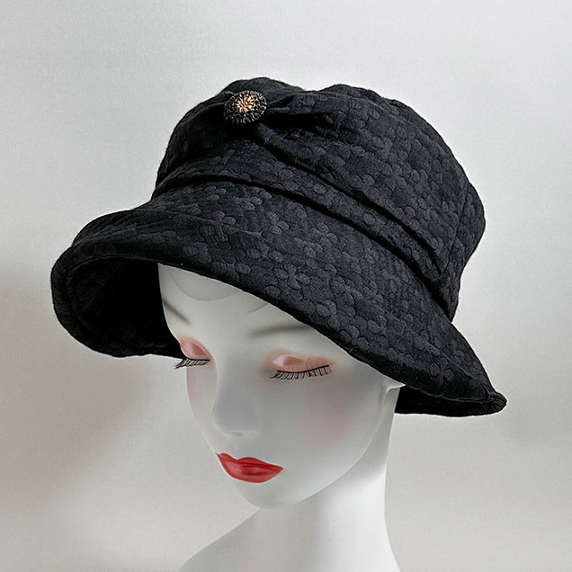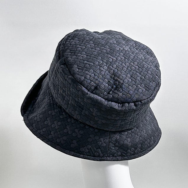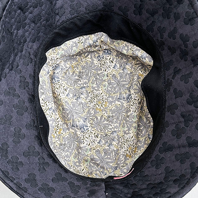 こちらのバケットハットにはブラックにクローバー(お花?)が織られた化繊生地を使いました。