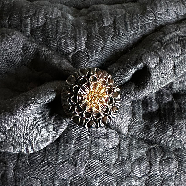 センターのリボンに縫い付けたアンティークボタン。ゴージャスでレトロな雰囲気がハットを引き立てます。