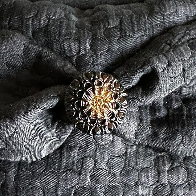 リボンを留めるヨーロッパ製アンティークボタンがアクセント。リボンは同色生地で上品になじみます。