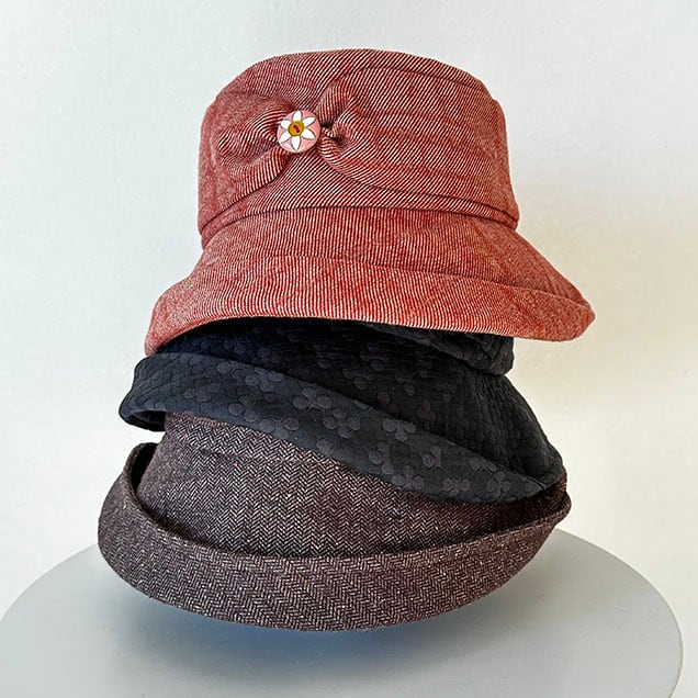 バケットハットの完成品の写真はMサイズ(58cm)ですが、S(56cm)、L(60cm)サイズも受注制作でご対応可能です。