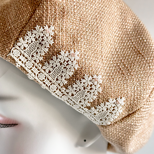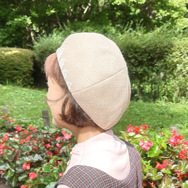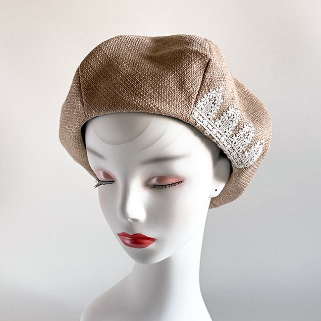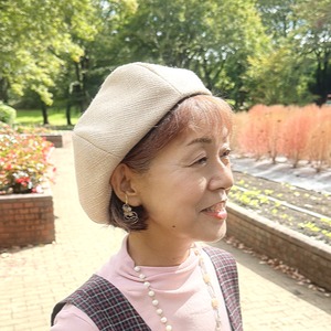 こちらのベレー帽はベージュ系。光沢のある糸で織られていて合わせやすいお色です。