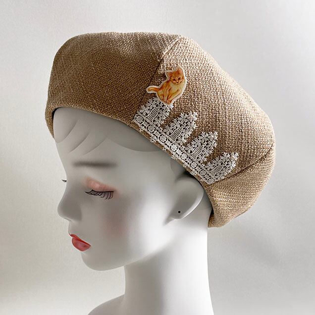 ベレー帽好きのyuumoがデザインした、被りやすい6枚はぎのベレー帽。小さな猫のプラバンブローチ付きです。