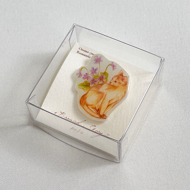 このブローチはイラストレーターのyuumo(森祐子)が色鉛筆で描いたオリジナルのイラストを元にプラバンで製作しています。