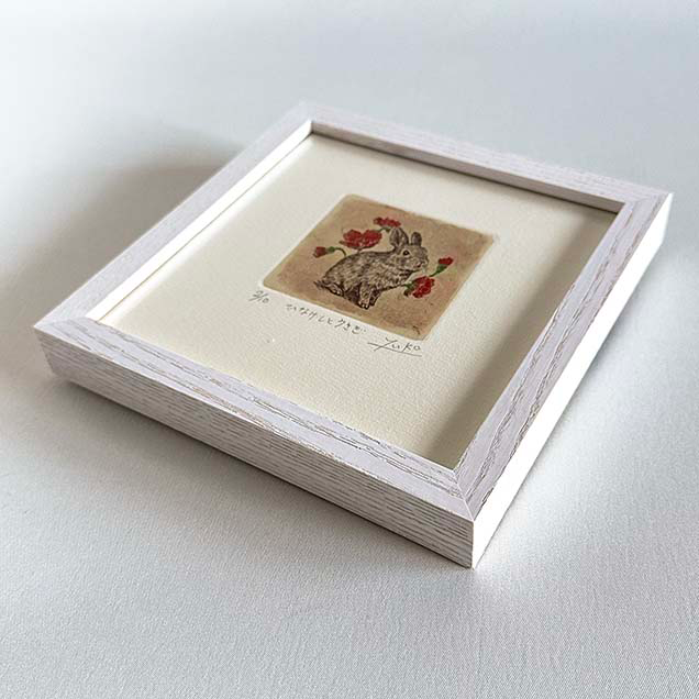 15cm角の小さな額に収めた銅版画作品『ひなげしとうさぎ』。