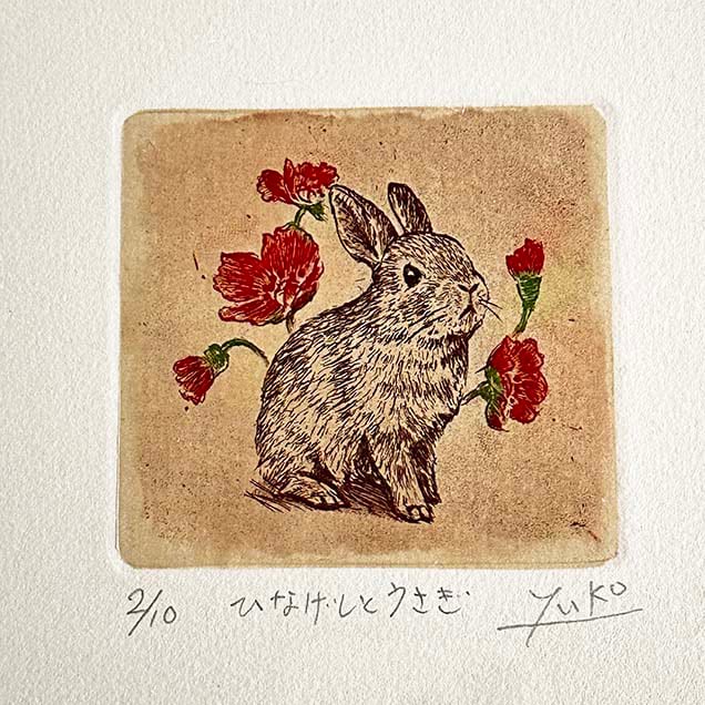 銅版画はひなげしの花の中でちょっとおすまししたうさぎを描いた『ひなげしとうさぎ』です。