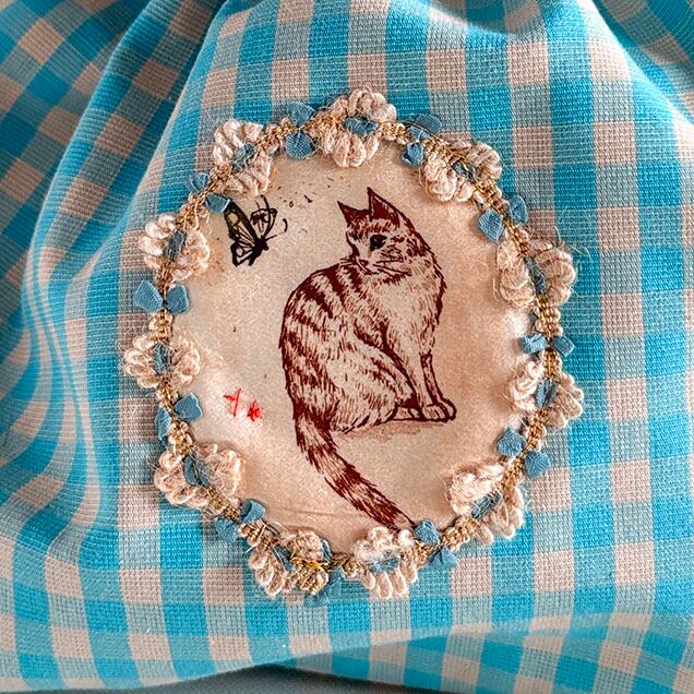 中央のシルクに刷った銅版画モチーフは小鳥と戯れる猫を描きました。タイトルは『ノコちゃん』です。