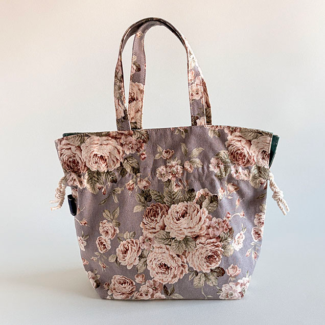 こちらのバッグは紫系のグレーに大胆に薔薇の花が描かれたコットンリネン。洋装にも和装にも合わせやすいデザインのバッグです。