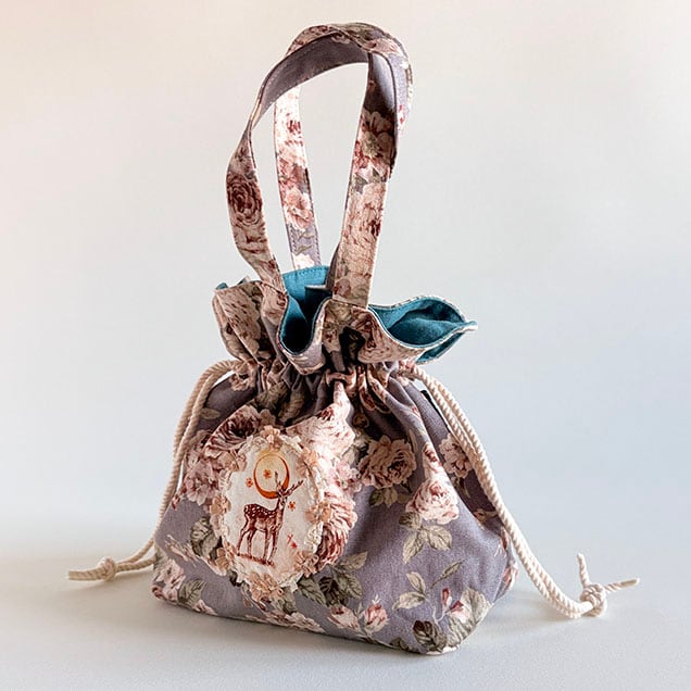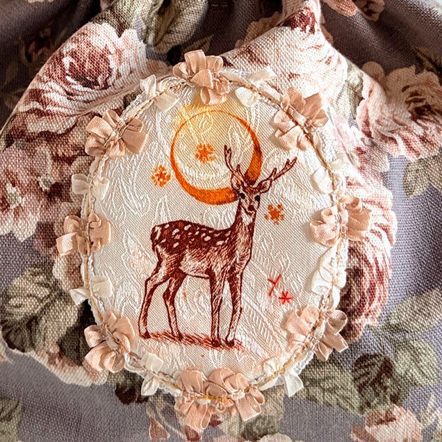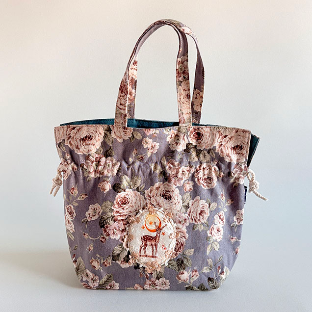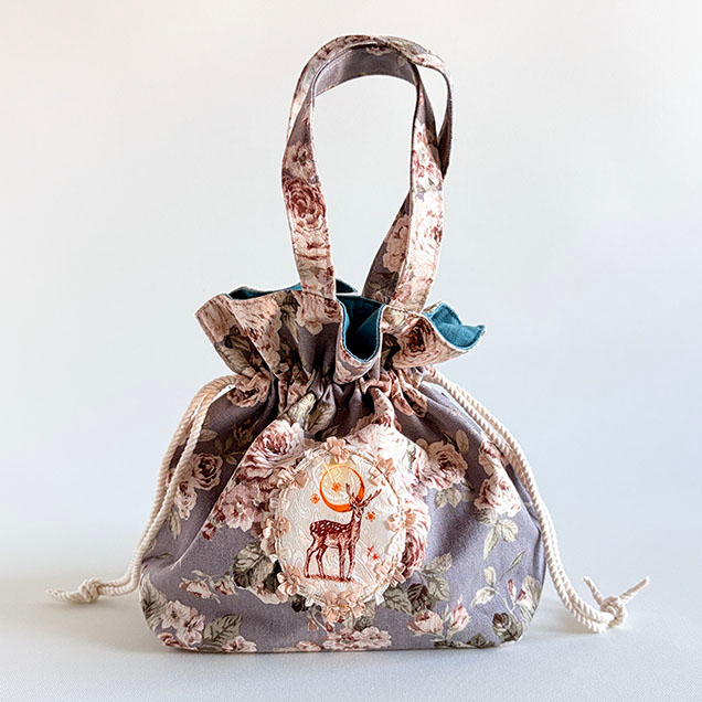 巾着ミニトートバッグ薔薇柄『三日月と鹿』