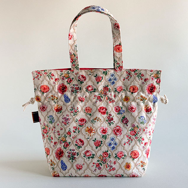 こちらのバッグはモロッカン+フラワー柄のコットンリネン。愛らしくて洋装にも和装にも合わせやすいデザインです。