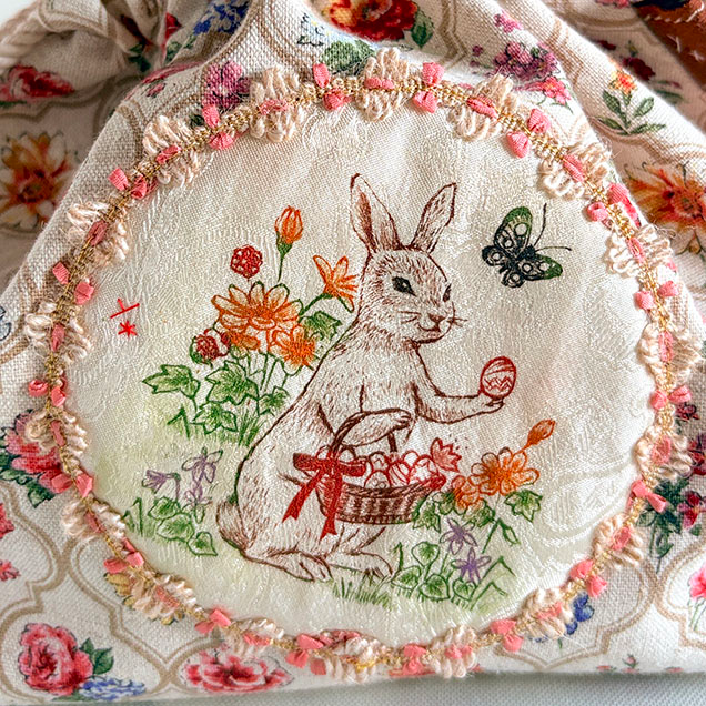中央のシルクに刷った銅版画モチーフは春の野原でにっこりと卵を差し出すうさぎさんを描いた『春待ちうさぎ』です。