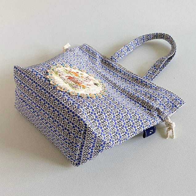 こちらのバッグは北欧系のような青い花柄プリントのコットンリネン。洋装にも和装にも合わせやすいデザインです。