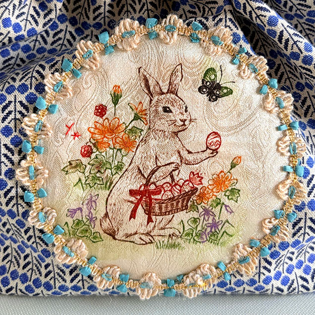中央のシルクに刷った銅版画モチーフは春の野原でにっこりと卵を差し出すうさぎさんを描いた『春待ちうさぎ』です。