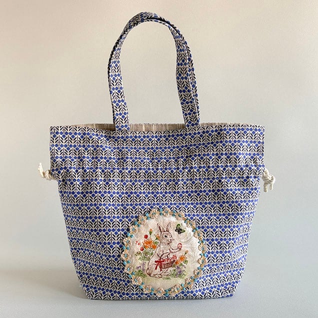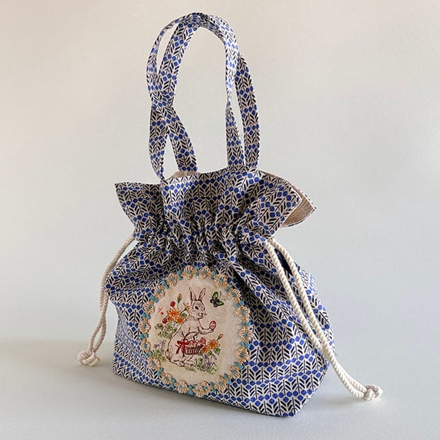巾着ミニトートバッグ青色『春待ちうさぎ』