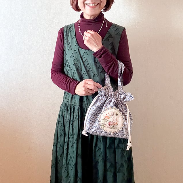 こちらのバッグは北欧系のような青い花柄プリントのコットンリネン。お洋服だけじゃなくて和服にも合わせてくださいね。
