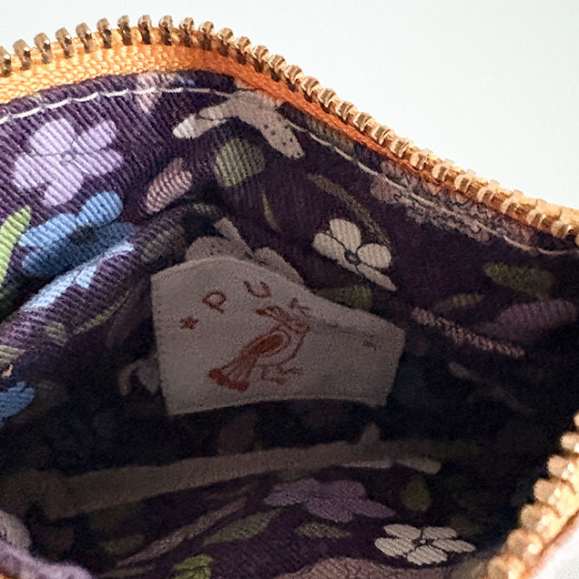 裏地はダークパープルに花柄プリントのコットンツイル。仕切りポケットが1口付いています。