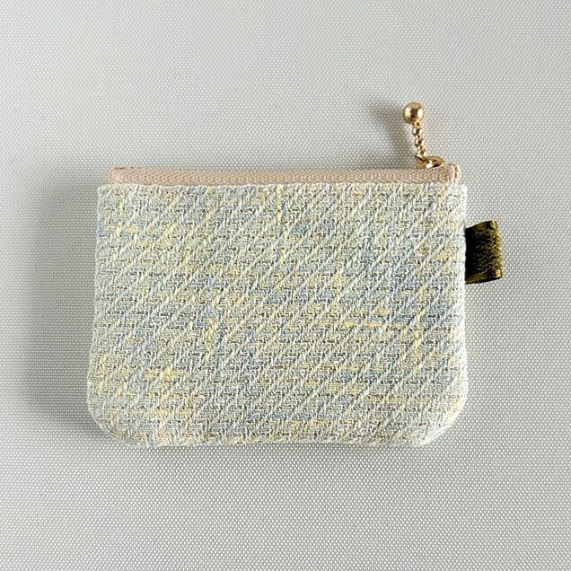 こちらの生地はフランス製。淡いミントグリーンのツイードです。ライトグリーン、水色、イエロー、ゴールドなどが織られています。