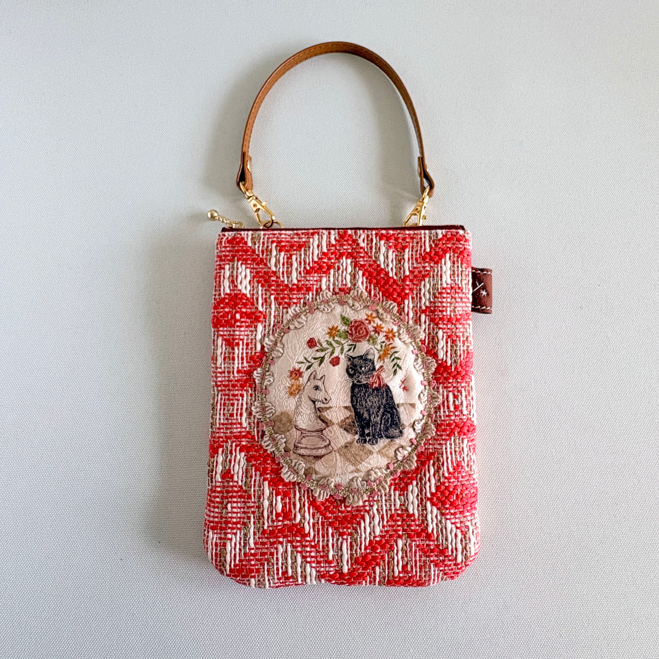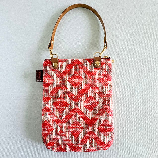 このスマホポーチに使った生地は華やかなコーラルレッドのスペイン製のツイード生地。大きな菱形がコーラルレッドやオリーブグリーン、オフホワイトのポコポコした糸で織ってあります。