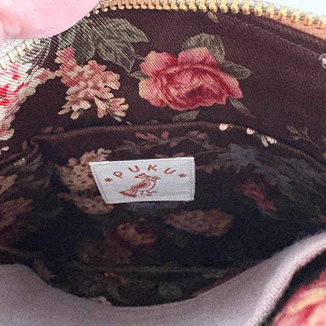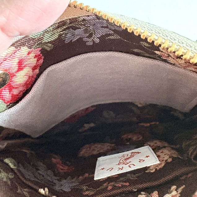 裏地はダークブラウンにアンティークな花柄がプリントされたコットンツイルです。内ポケットは仕切りになるポケットと、カードポケット(コットンリネン)の2口です。