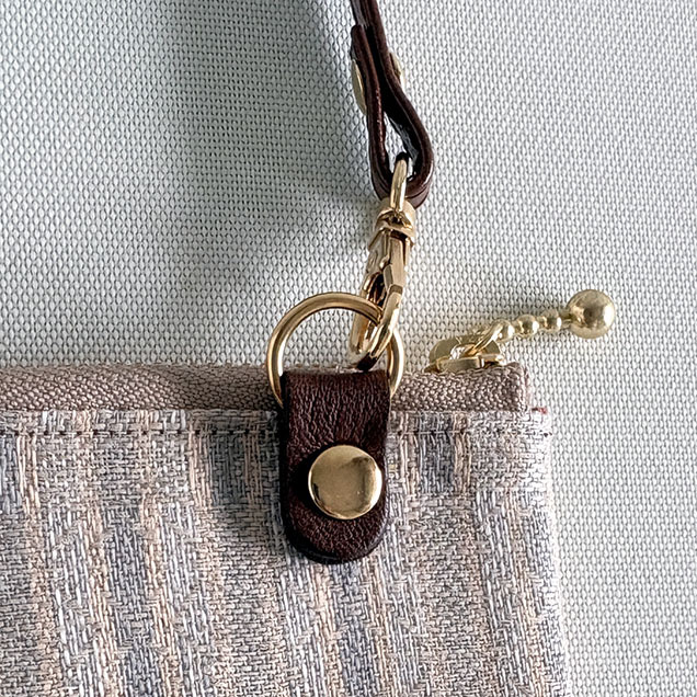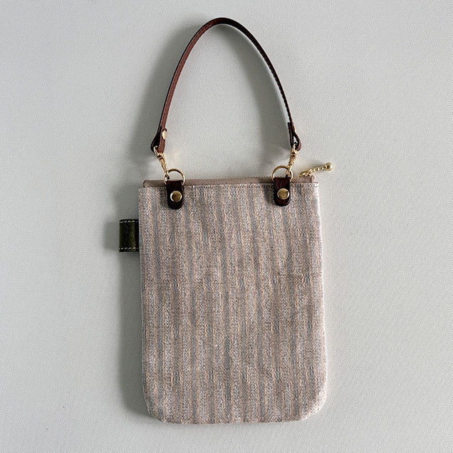 このスマホポーチに使った生地はイタリア製のサンドベージュの麻生地。淡いオレンジ色やカーキで織られています。